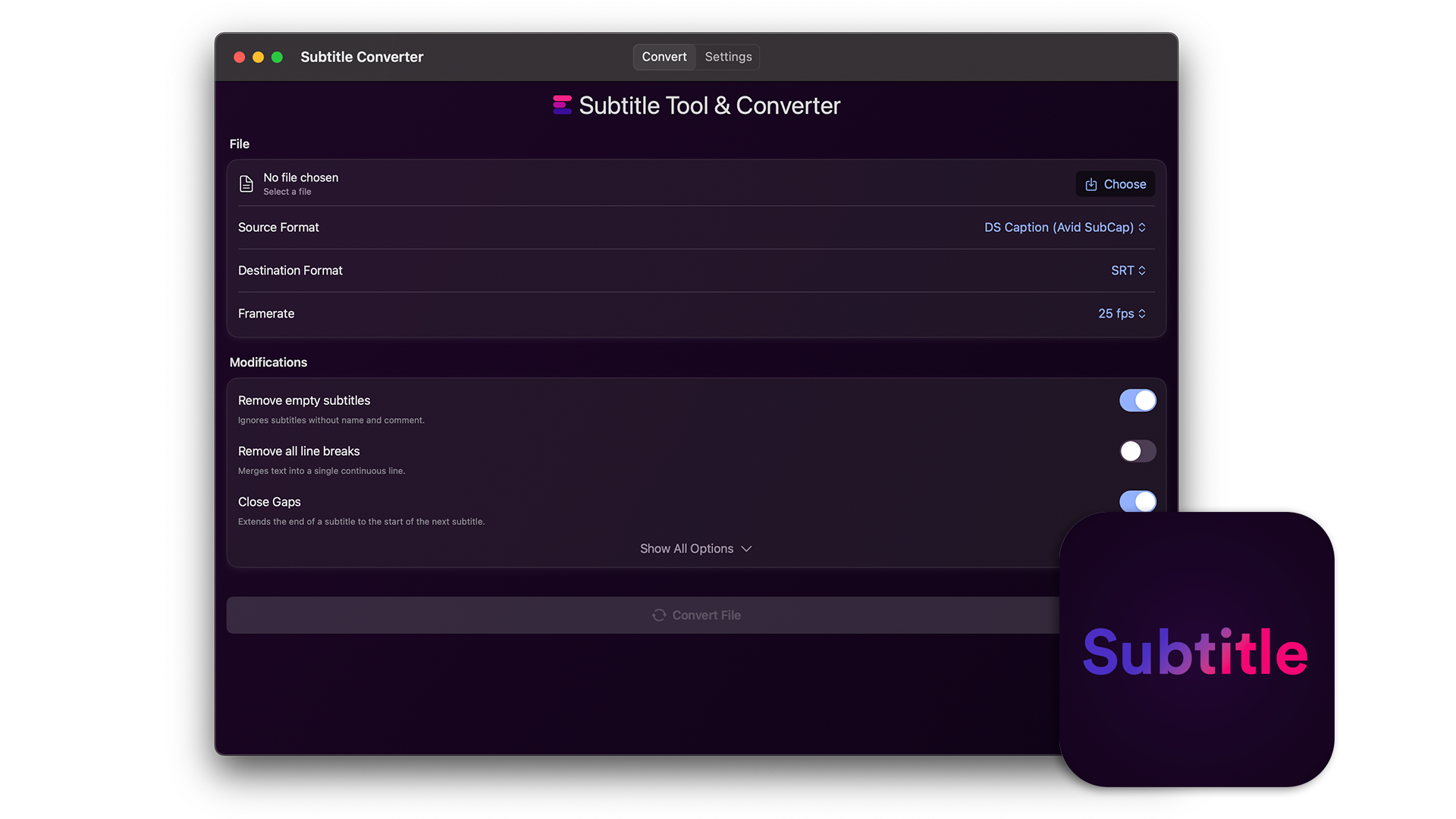 Konvertiere Untertitel Dateien in andere Dateiformate oder verwende das Tool um Untertitel auf Richtlinien zu überprüfen, zu reparieren oder zu korrigieren.
